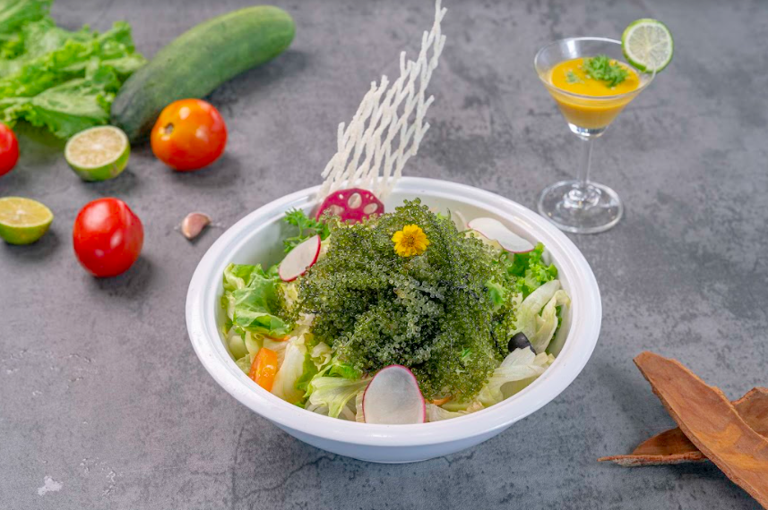 - Salad rong nho có nguyên liệu chính là rong nho- một loài rong biển quý, hiếm và có giá trị dinh dưỡng cao, có tác dụng kháng khuẩn, nhuận trường và bổ máu...